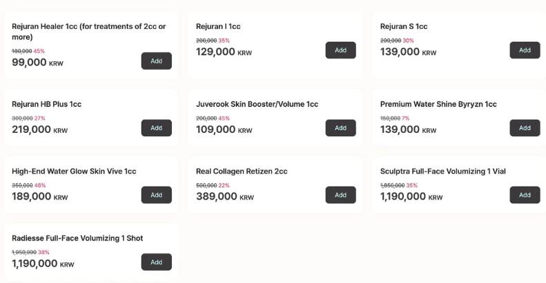 Skinvive, Radiesse, Waterglow Injection, Rejuran Healer, Q-Facial, LDM, Waterdrop Lifting Peel, Mall DM.Cell, Skin Plus Ampoule, Exosome (G-MPF), Lilied M, Juvelook, Chanel Injection, Aqua Shine BTX, Vital Injector 2, Dermashine Balance, Skinbooster Pro, Shining Peel, Oxygen Dome Facial, LED Light Therapy, Calming Care Facial, Hydration Infusion Therapy, Brightening Facial, Sebum Control Facial, Pore Tightening Booster, Moisture Glow Shot, Glutathione IV, Vitamin C Drip, Anti-aging Cocktail Drip, MTS + Ampoule Facial, Gua Sha Facial, High-Frequency Facial, Acne Peel, Enzyme Peel, Milk Peel, Mandeli Clear Peel, Salmon DNA Booster, PolyNucleotide Therapy, 5GF Ampoule Therapy
